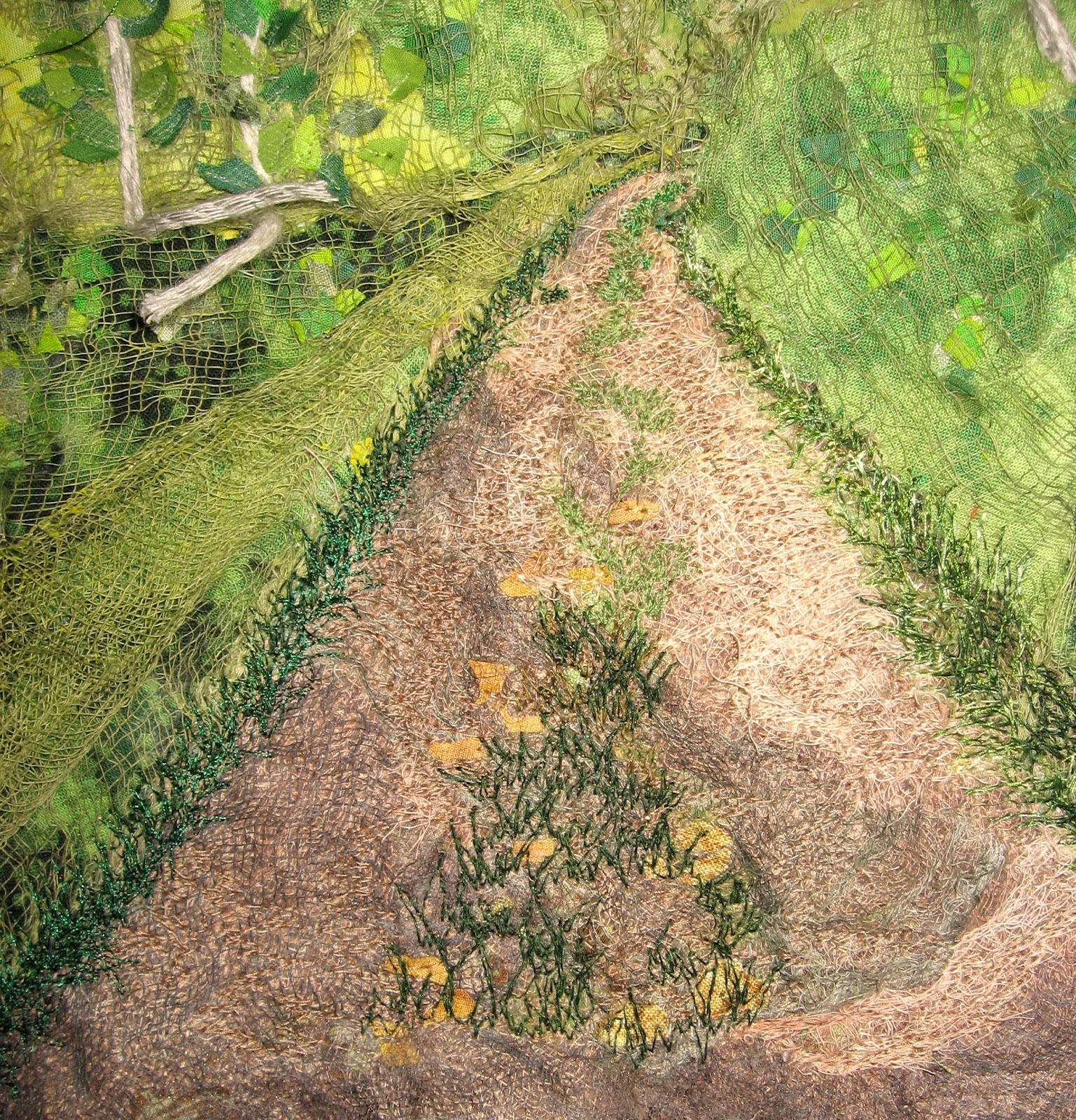 Over that I placed another layer of pale beige gauze to imply a brighter intensity of light on the path. Then I held my breath and started stitching, first with beige and browns.