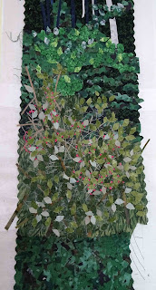 I spent an hour 'sketching' small trees onto netting. These were to be positioned down the distant slope on the right side of the canyon. However, when I went to place them in position I realized I had to deal with the sky...finally. It would have been very difficult to stitch around the tiny trees.