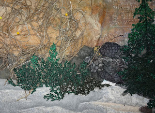 While that was drying I stitched a few 'fringes' of 'trees and shrubs' that I tucked into the very back. It completes the horizon line and then with some shards of cheesecloth glued to the surface and some paint, its done.